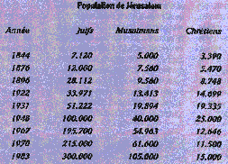 Ces chiffres sont extraits de l'«Encyclopaedia Britannica» (Grande-Bretagne, 1844), de l'«Indicateur de la Terre sainte» (France, 1876), du «Calendrier palestinien» (1896) et de recensements officiels et semi-officiels qui ont été effectués à Jérusalem et dans les environs. Ces données sont parfois étrangement précises et ne peuvent certes pas être comparées aux résultats des recensements modernes. Cela ne les empêche cependant pas de réfuter l'allégation arabe actuelle voulant que Jérusalem fût une ville principalement arabe et qu'elle ne soit devenue juive qu'à la fondation de l'Etat d'Israël.
