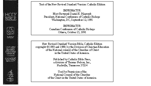 Voici une Bible œcuménique, produite par des gens de différentes croyances confessionnelles, les droits d'auteur appartenant à l'organisme apostat du Conseil national des églises des États-Unis, édition Catholique romaine, vendu par la SBC. Ce n'est pas tout. L'édition que je viens de démontrer est une édition produite originalement par le Catholic Bible Press une division de Thomas Nelson Publishers que nous allons voir au 5e chapitre. Cher ami comme j'ai fait mention plus tôt, nous faisons face à une toile dévastatrice où chaque fil se rejoint afin d'adoucir le message et d'accéder à une ère de tolérance envers les autres croyances confessionnelles, qui nous conduira vers les Religions Unies.