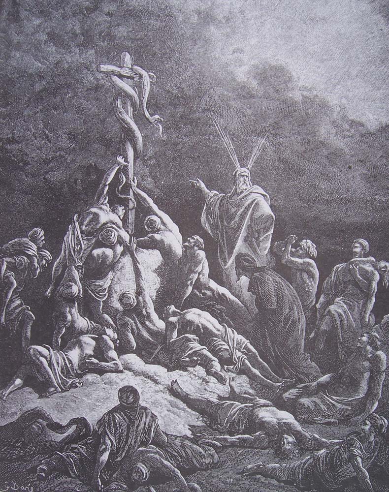 - Alors l'Éternel envoya contre le peuple des serpents brûlants; ils mordirent le peuple, et il mourut beaucoup de gens en Israël. (Gravure de Gustave Doré)