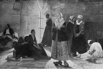 Lorsque celle-ci franchit le seuil de la vieille Tour, la salle où elle devait résider (était-ce celle d'en bas ou la plus élevée ? nous ne savons) offrait le spectacle suivant : les meurtrières avaient été garnies de planches ou peut-être de tentures destinées à briser les courants d'air, malgré tout trop sensibles encore. Dans l'une d'elles, située près de la cheminée, et séparée de la salle par une porte basse, on avait aménagé les « lieux communs » ; le visiteur peut voir encore les cavités préparées pour recevoir les poutrelles qui supportaient un plancher grossier. La prison elle-même était meublée de quelques bancs, de paillasses avec des draps et des couvertures, appuyées sur des tréteaux. Le tableau de Mlle Lombard offre donc à cet égard, dans son émouvante évocation de la dure prison, une réelle exactitude.